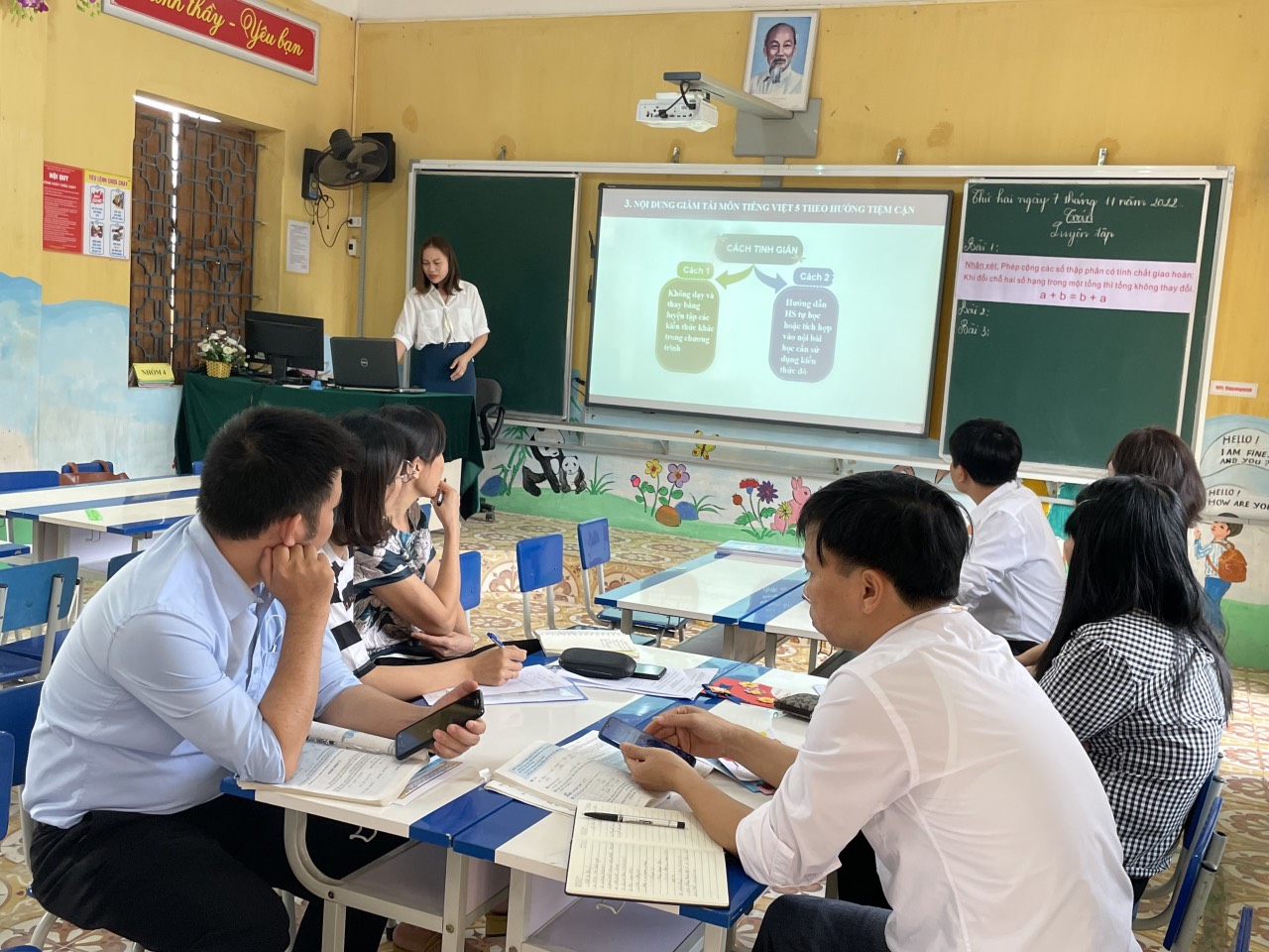 Sau tiết dạy, BGH và giáo viên hai nhà cùng trao đổi một số vấn đề như: Thực hiện và điều chỉnh nội dung đảm bảo kiến thức cốt lõi và mở rộng tiếp cận với chương trình lớp 6; phương pháp dạy học theo nhóm; hình thức tổ chức trên lớp; hình thành kĩ năng nghe - ghi ở những công đoạn nào trong tiết dạy; kiểm soát, đánh giá học sinh trong giờ dạy; hướng dẫn học sinh tự học, tự nghiên cứu tài liệu.